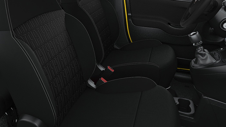 Be comfortably seated on the new black fabric seats combined with recycled seaqual yarn, white stiching and the Fiat logo embossed.
